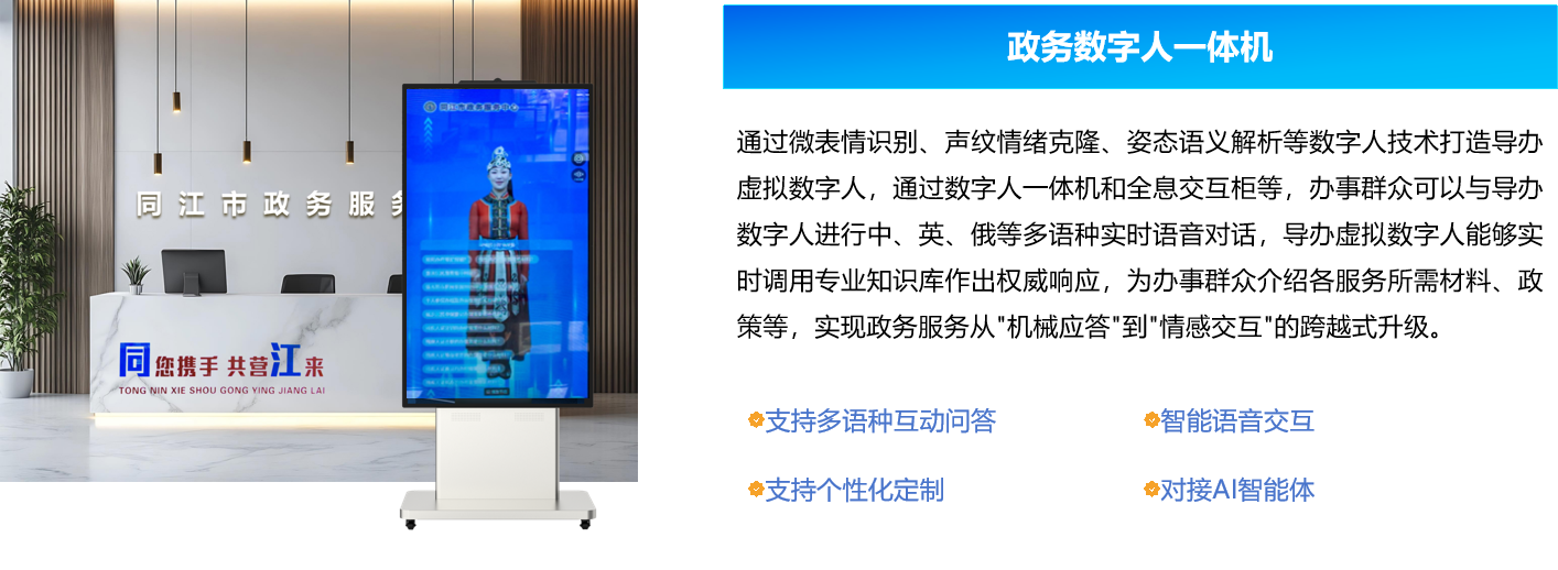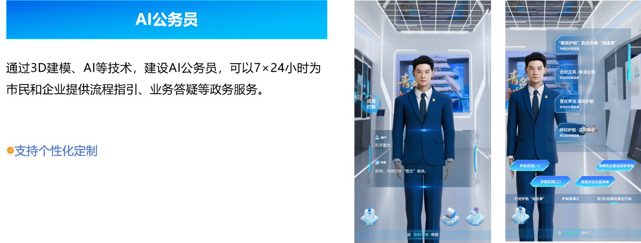 为提升政务服务效能,在政务领域,道可云依托AI、元宇宙、数字人、大数据等技术构建智慧政务服务中枢,打造集AI数字公务员、政务元宇宙办事大厅、VR实景导航、数字人互动等服务于一体的政务AI元宇宙平台。