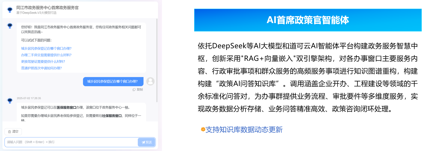 平台集智能导办、虚拟数字人互动讲解、场景漫游、路线指引、政务问答等功能于一体,沉浸立体展示政务服务中心的地理位置、业务布局、窗口设置等内容。依托DeepSeek大模型底座和道可云AI智能体平台构建AI首席政策官智能体,对各办事窗口主要服务内容、行政审批事项和群众服务的高频服务事项的数据进行知识图谱重构,构建“政策AI问答知识库”,为办事群提供业务流程、审批要件、办理时限等多维度服务,实现政务数据分析存储、业务问答精准高效、政策咨询闭环处理。