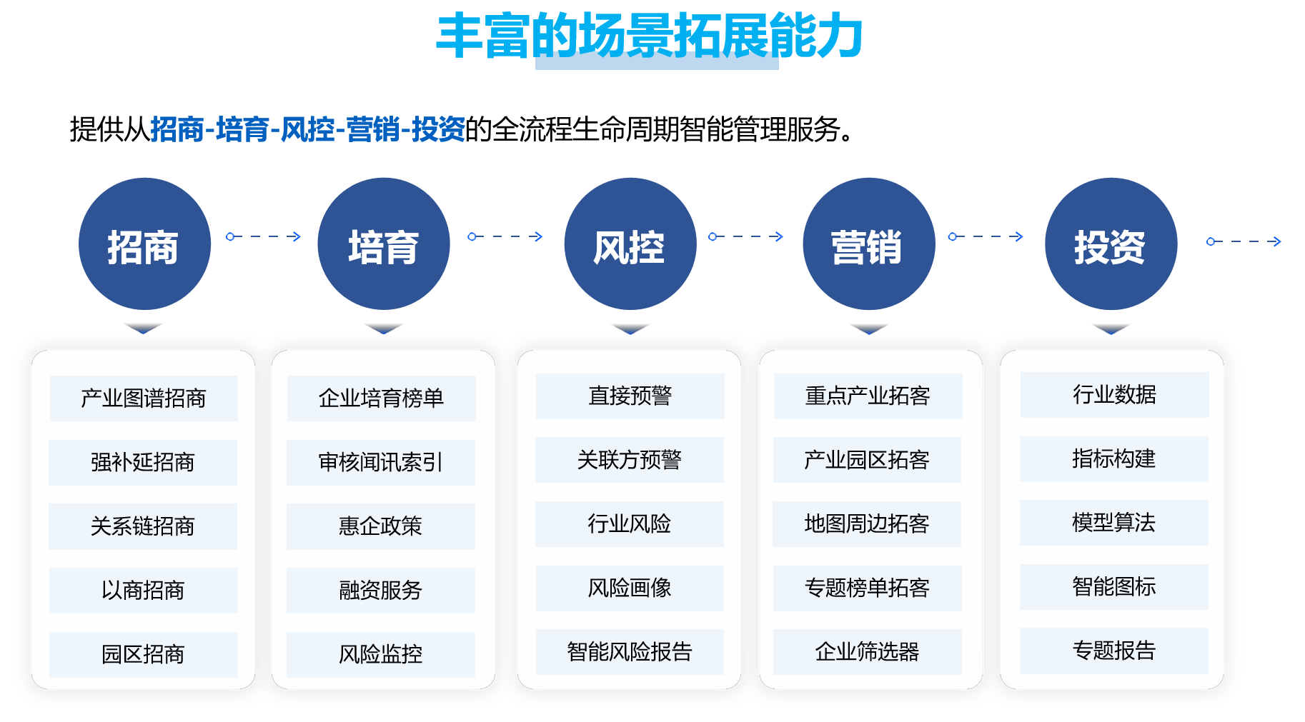 通过VR、AI、数字人等技术打造集元宇宙场景搭建、招商虚拟数字人、产业全景、特色产业展示、招商地图、投资洽谈等要素为一体的招商元宇宙平台,为园区、投资人、企业提供全方位、一站式的招商引资服务。