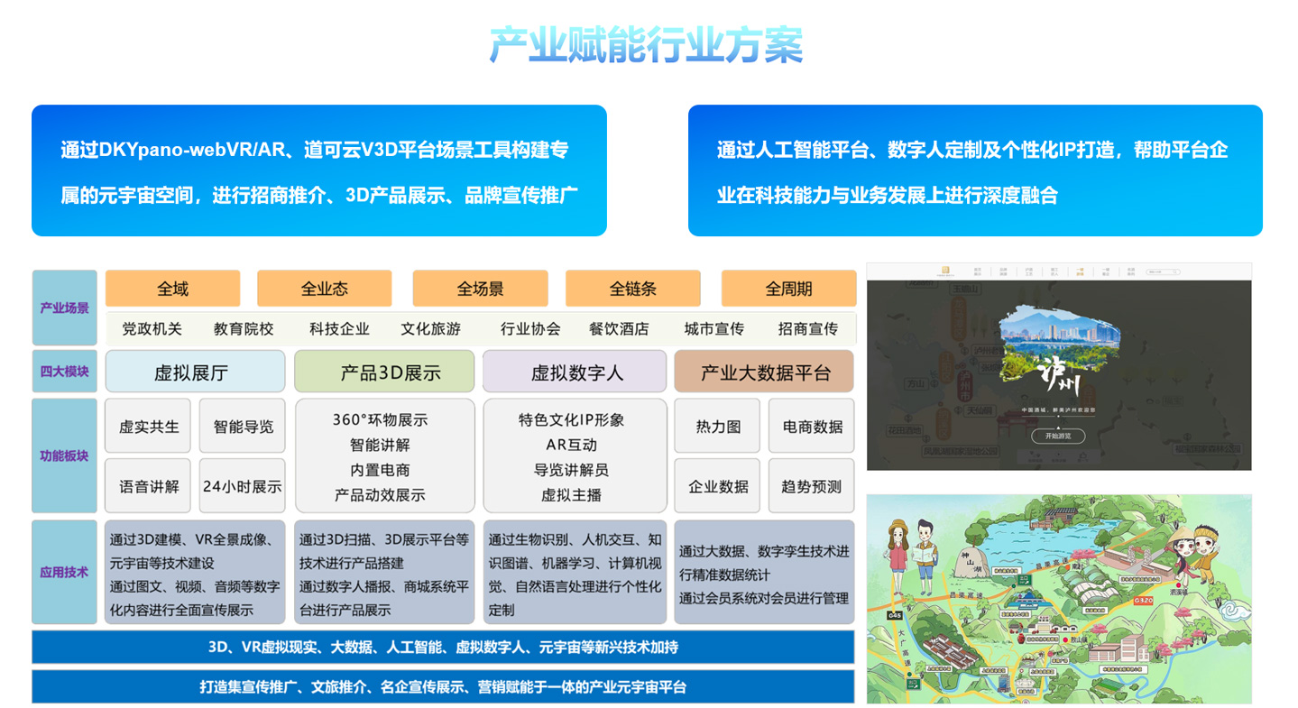 通过3D、VR虚拟现实、大数据、人工智能、虚拟数字人、元宇宙等新兴技术加持,打造了集元宇宙场景搭建和产业运营于一体的产业元宇宙平台。实现搭建行业会展、城市文旅、特色产业招商、特色产品销售等,通过全要素数字化汇聚、全链条数字化融合、全主体数字化赋能,更好地实现政府监管和产业扶持、产业赋能。