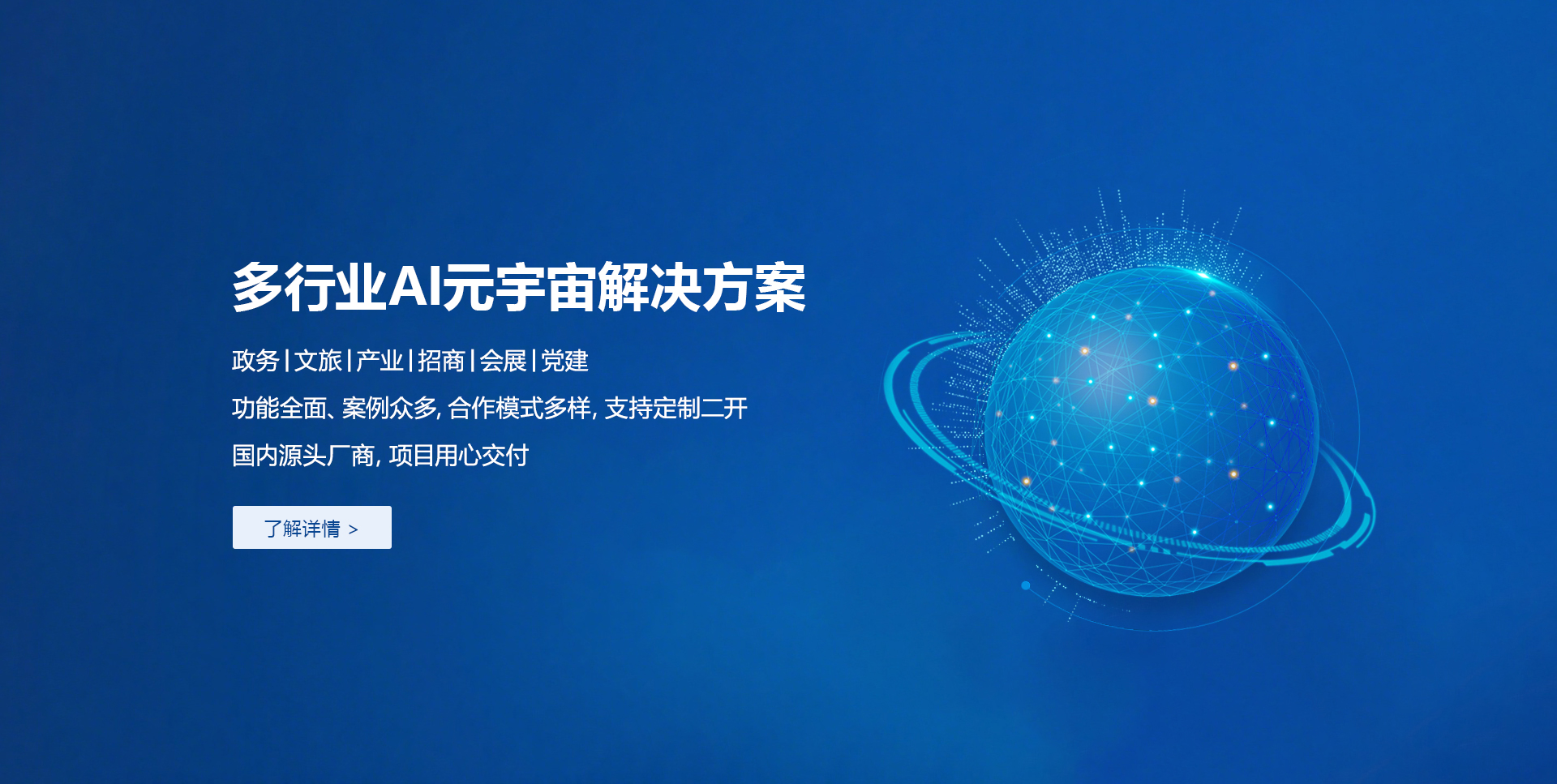 以 VR、AI、虚拟数字人为核心技术支撑,构建集元宇宙场景搭建、虚拟数字人招商助理、产业全景孪生、特色产业虚拟展厅、智能招商地图、沉浸式投资洽谈空间于一体的六大功能模块招商元宇宙平台。